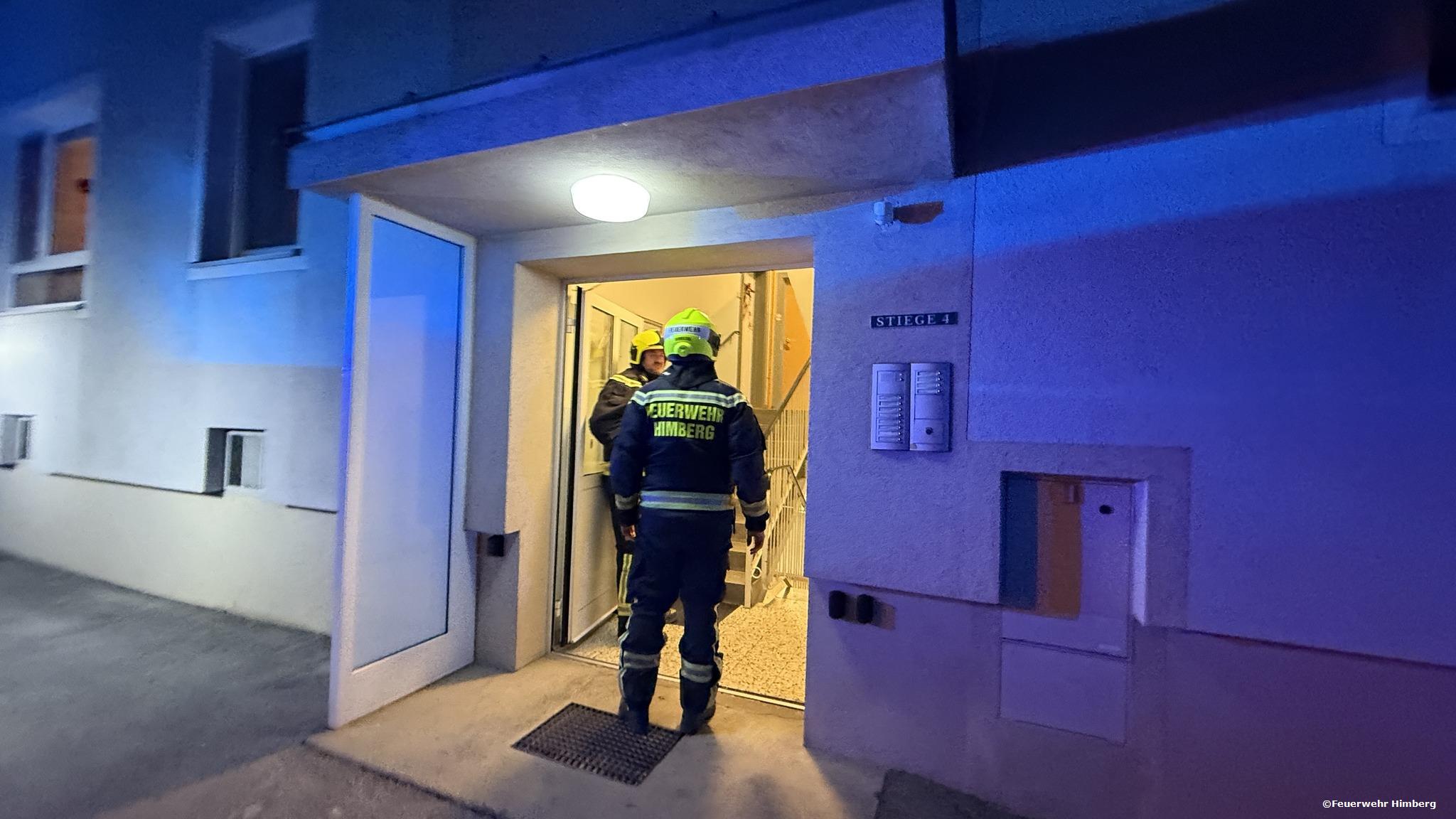 Drei Fahrzeuge der Feuerwehr Himberg trafen innerhalb weniger Minuten am Einsatzort ein. Der Einsatzleiter wurde vor Ort von Rettungsdienst und Polizei in die Lage eingewiesen. Laut Erstinformationen befand sich eine verletzte Person in der Wohnung, die die Eingangstür nicht mehr selbstständig öffnen konnte. Um mögliche Gefahren auszuschließen, stellte der Einsatzleiter vorsorglich einen Trupp mit umluftunabhängigem Atemschutz sowie ein Mehrgasmessgerät in Bereitschaft, um eine mögliche Kohlenmonoxidbelastung auszuschließen.