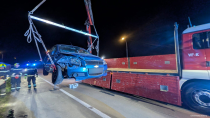 Im Anschluss erfolgte die Bergung des Fahrzeugs mittels Kran des Versorgungsfahrzeugs. Nach der notwendigen Beseitigung der herumliegenden Fahrzeugtrümmerteile konnte die Fahrbahn wieder sicher für den Verkehr freigegeben werden.