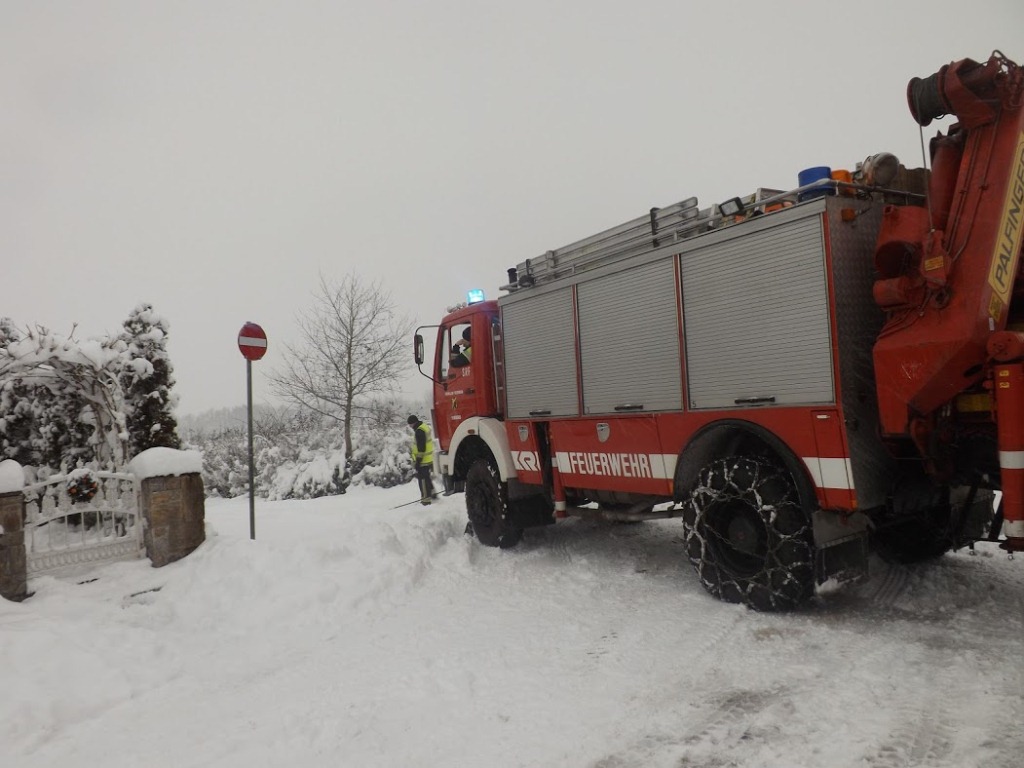 Kurz Nach Mittag geht der Einsatzmarathon weiter. Drei LWKs und auch die Räumfahrzeuge der Gemeinde blieben auf Grund der schlechter Straßenverhältnisse und dem extremen Schneefall auf eine abschüssigen Fahrbahn stecken. Mittels Seilwinde wurden alle Fahrzeuge geborgen.