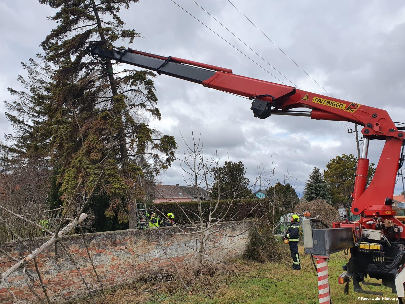 Mit dem Höhepunkt des Sturmtiefes „Petra“ stiegen auch die Einsatzzahlen der Feuerwehr Himberg. Von 9 bis 17 Uhr standen die Einsatzkräfte nahezu durchgängig im Einsatz, in Summe musste bis am Abend bei insgesamt 21 Sturmschäden technische Hilfe geleistet werden. Neben abgebrochenen Ästen, losen Dachelementen oder umgestürzten Bäumen und auch umgestürzten Bauzäunen reichte das Einsatzspektrum. Kurz vor Mittag wurde mit Absprache der Gemeinde auch alle Zugänge der Wälder vorübergehend zur Gänze gesperrt. Ebenfalls unterstützen die Kameraden der Feuerwehr Himberg die Nachbarwehr in Pellendorf. Hier brach ein Baum in die Hochspannungsleitung und verursachte einen flächendeckende. Stromausfall. Nach Absprache mit dem Energieversorger wurde ein weiterer Baum, welcher ebenfalls umzustürzen zu drohte, gesichert geschnitten. Währende der Arbeiten musste aus Sicherheitsgründen die Stromleitung stromlos geschalten werden.